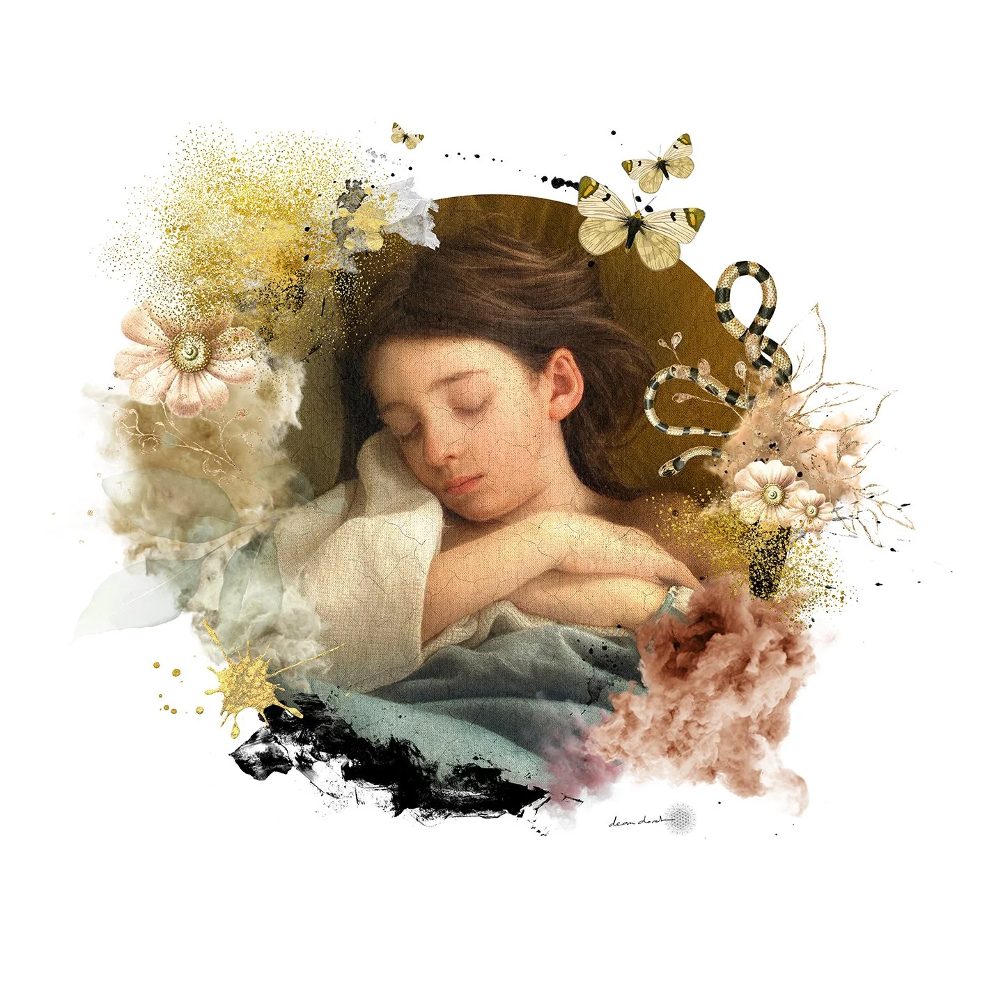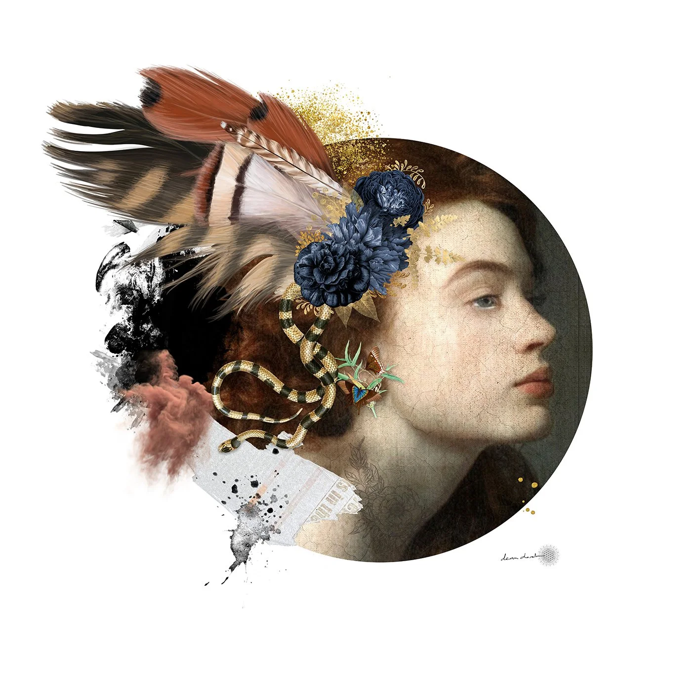 Je travaille également à partir de photographies de personnes croisées sur mon chemin ou qui me sont proches. Au-delà du portrait classique, j’y ajoute ensuite des éléments graphiques, résonance des émotions qui émergent au fil du processus créatif, comme une traduction allégorique de leur âme.